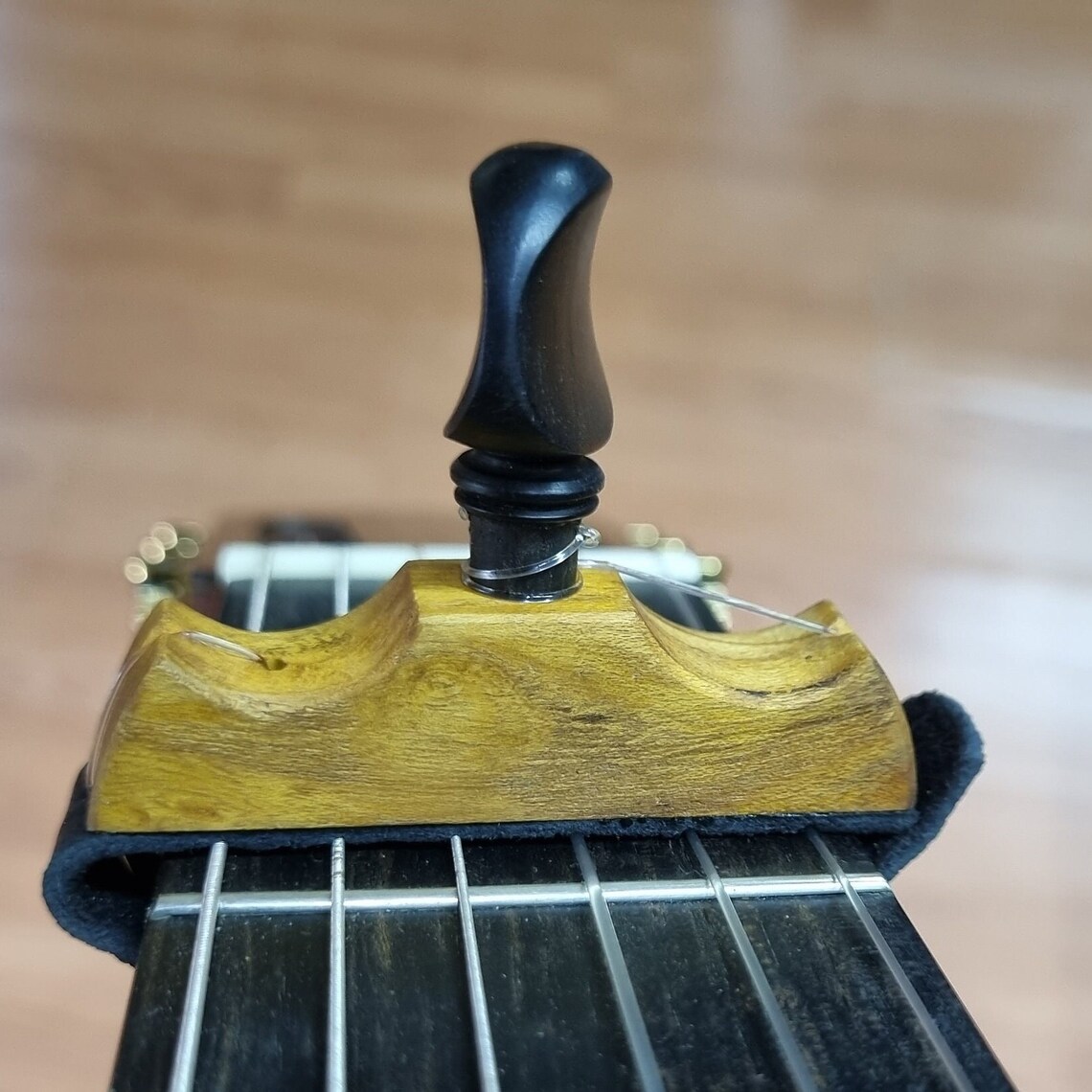 This capo is made from natural wood, Black Exotic Ebony and white burl maple in my workshop in Turkey. Lock down Peg made of Ebony – Works like a dream! locks down quickly, easily, accurately and stays in position.